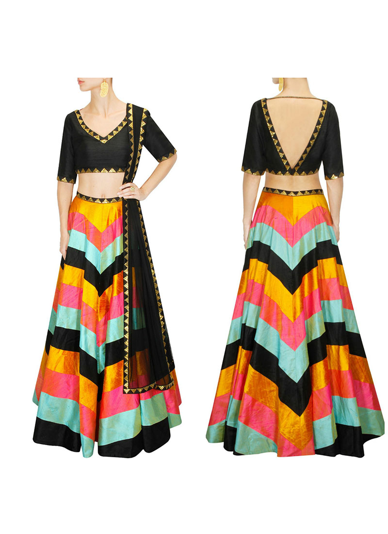 Navratri Special Embroidered Raw Silk Zigzag Black, PInk, Yellow, Blue Digital Printed Lehenga With Black Choli and Dupatta. Note: This is Semistitched and needs to be fitted and stitched according to your size. If You Opt Stitching Option, Measurement chart will send to you via email after placing order.