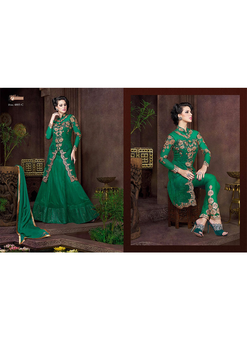 Net Top Emblished with Thread work, Zari work, Studded Stones,With Silk Bottoms For Lehenga and Pants A And Net Dupatta Note: Suit is Semi stitched and needs to be fitted and stitched according to your size. If You Opt Stitching Option, Measurement chart will send to you via email after placing order. Contact us for Sticthing Charges Link.