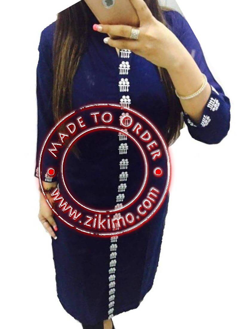 Blue Cotton Stylish Long Kurti With White Embroidery work.Note: This is Semi stitched and needs to be fitted and stitched according to your size. If You Opt Stitching Option,Measurement chart will send to you via email after placing order
