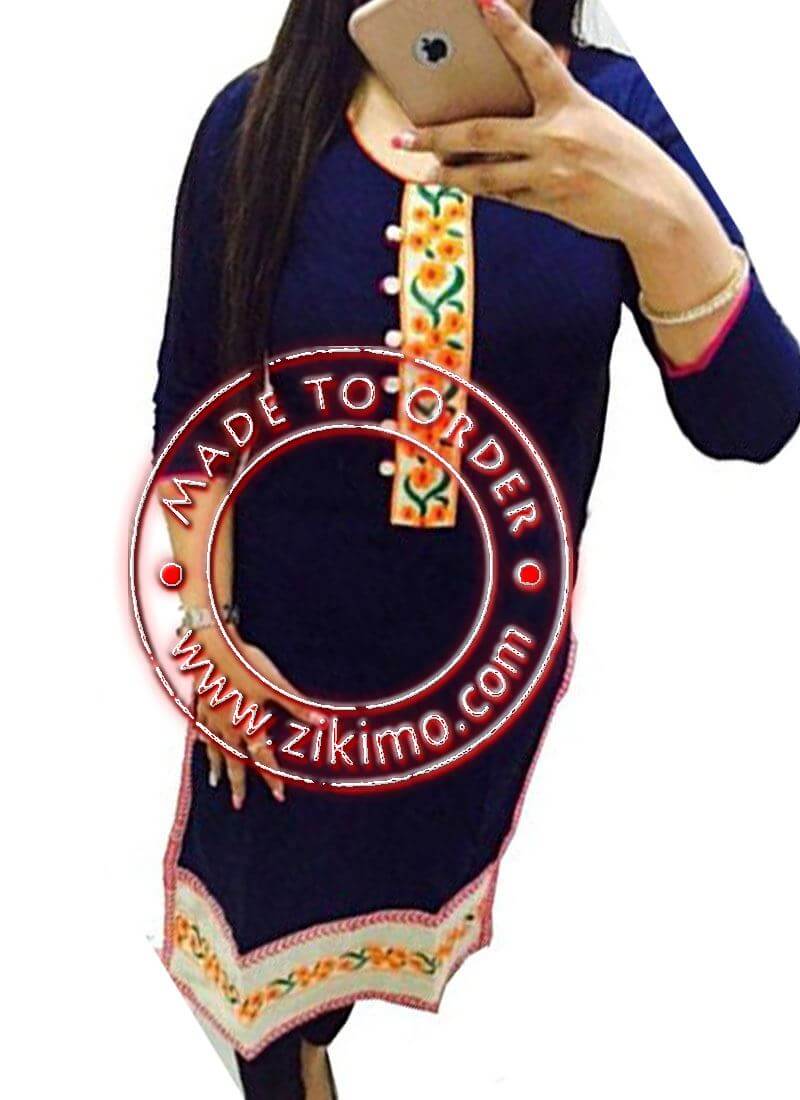 BlueCream Cotton Long Kurti With NeckPattiAnd Ghera Embroidery.Note: This is Semi stitched and needs to be fitted and stitched according to your size. If You Opt Stitching Option,Measurement chart will send to you via email after placing order