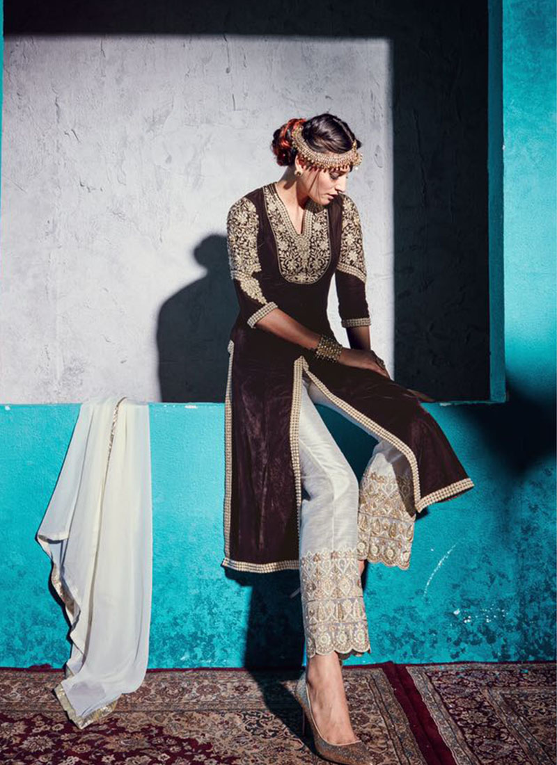 Velvet Embroidery work Done Party Weddding Wear Long Straight Top With Shantoon Bottom And Chiffon Dupatta Note: This is Semi stitched and needs to be fitted and stitched according to your size. If You Opt Stitching Option, Measurement chart will send to you via email after placing order.