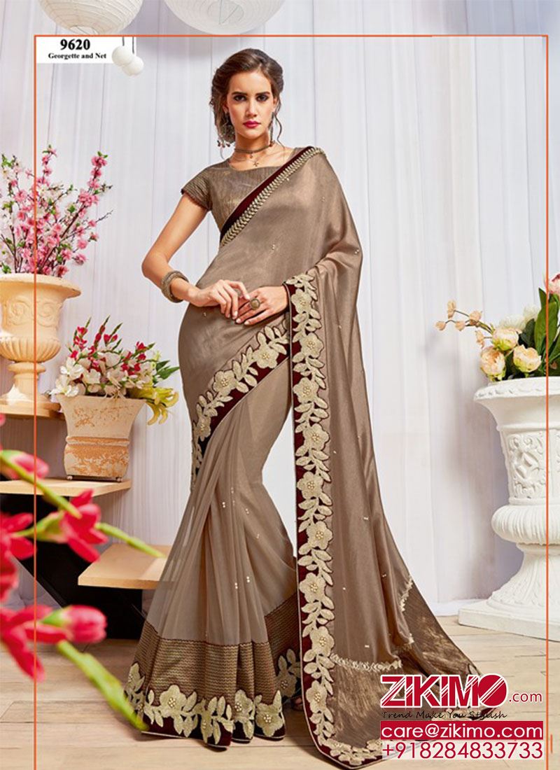 Brown9620 SilkGeorgette PartyWear Saree With Brocade Blouse at Zikimo - Zikimo.com - Original Indian Bridal Lehengas Collection