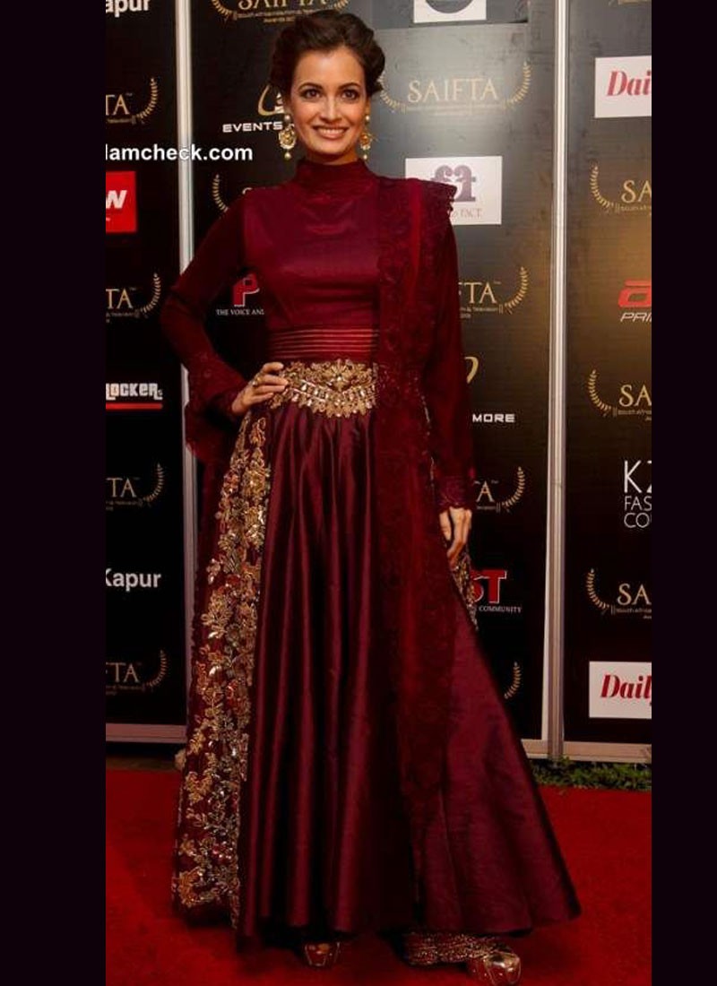 Affection to take after the lead of the Bollywood diva Dia Mirza? At that point gain this maroon glossy silk lehenga choli highlighting gold zardozi weaving. The gathering incorporates a high-neck long choli and a coordinating dupatta.