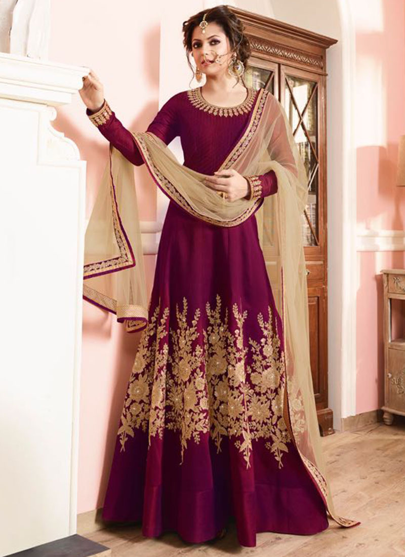 Malbury Silk Embroidery work Done PartyWear Long Anarkali Top With Shantoon Bottom And 4 Side Lace Net Dupatta Note: This is Semi stitched and needs to be fitted and stitched according to your size. If You Opt Stitching Option, Measurement chart will send to you via email after placing order.