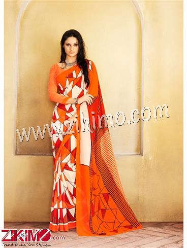 Orange and Cream Chiffon Saree With Blouse Piece 4029 - Zikimo.com - Original Indian Bridal Lehengas Collection
