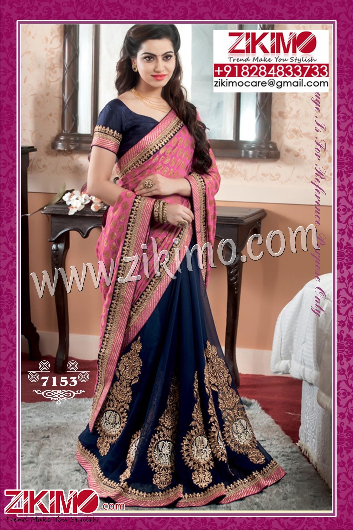 Pink Pure Viscose Pallu Blue Georgette Saree With Raw Silk Blouse - Zikimo.com - Original Indian Bridal Lehengas Collection