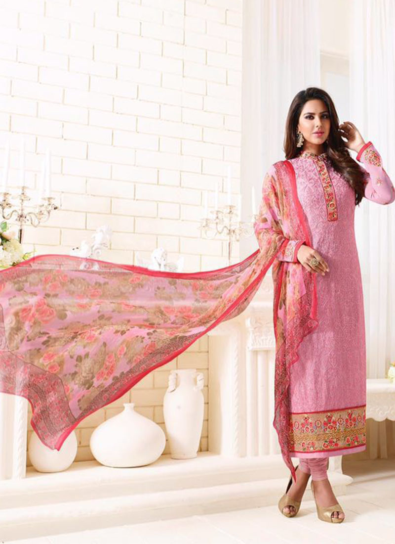 Georgette Indian Party Wear Top With Shantoon Bottom And Floral Printed Chiffon Dupatta Note: This is Unstitched and needs to be fitted and stitched according to your size. If You Opt Stitching Option, Measurement chart will send to you via email after placing order.