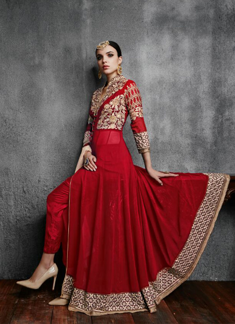Red11003CGeoregtte Floor Length Party Wear Embroidered Suit at ZIkimo - Zikimo.com - Original Indian Bridal Lehengas Collection