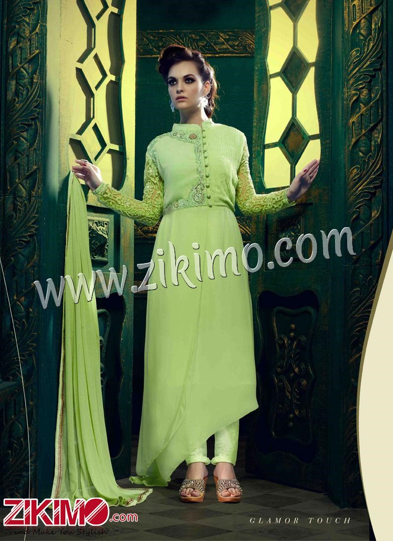 Royal Palace 9004 PISTA GREEN GEORGETTE DESIGNER High Low Anarkali Salwar Kameez - Zikimo.com - Original Indian Bridal Lehengas Collection