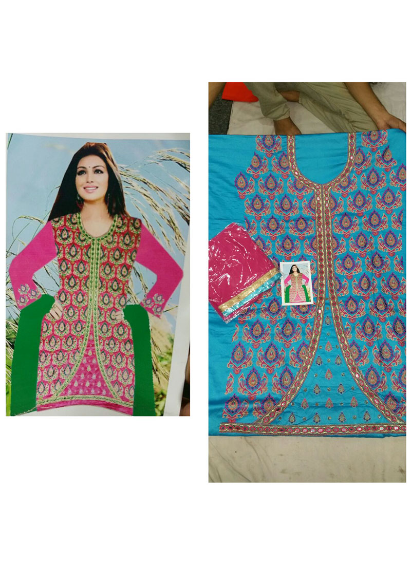 Jam Cotton Silk All Over Punjabi Salwar Suit With Chiffon Duppta.Note: Suit is Unstitched and needs to be fitted and stitched according to your size. If You Opt Stitching Option, Measurement chart will send to you via email after placing order. Contact us for Sticthing Charges.