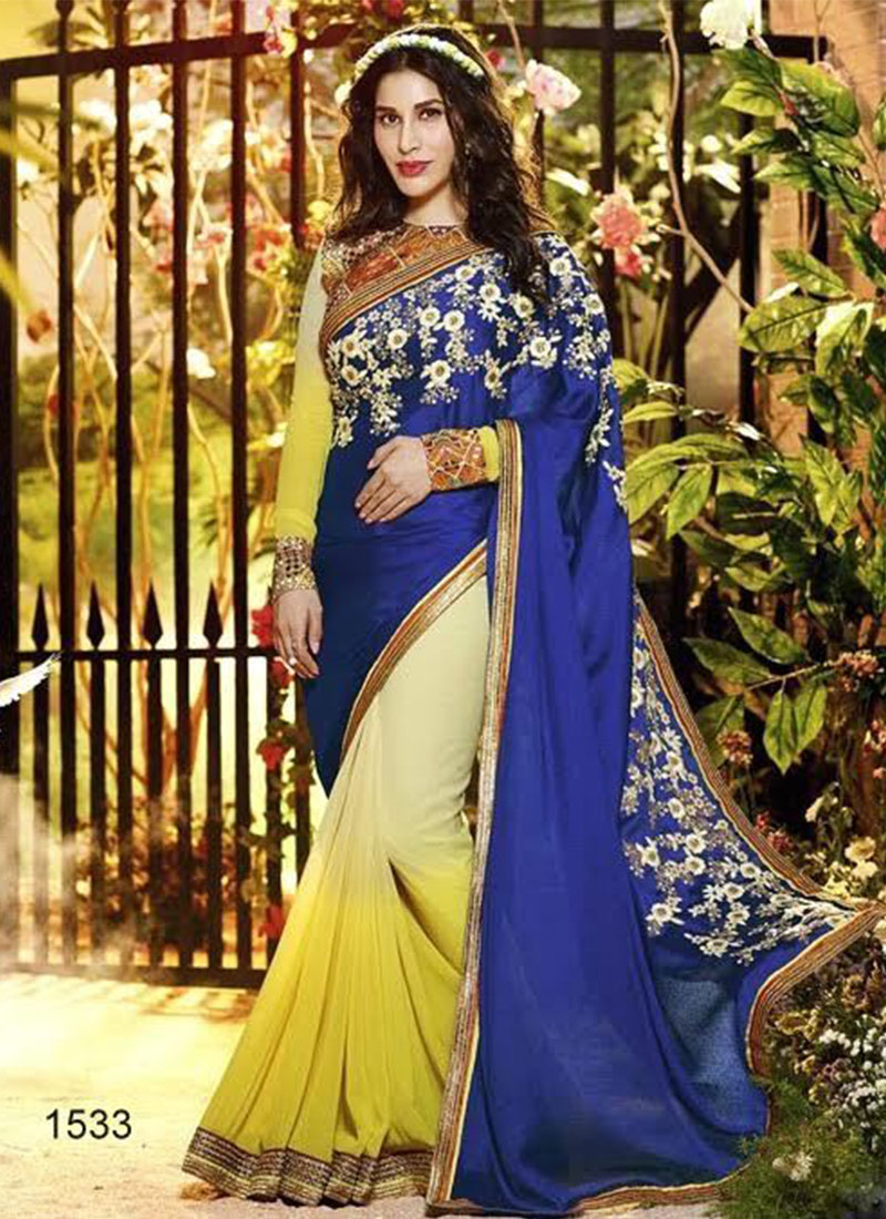 Sophie Lemnon Yellow and Blue 1533 Georgette Wedding Party Wear Saree With Bhagalpuri Print Blouse