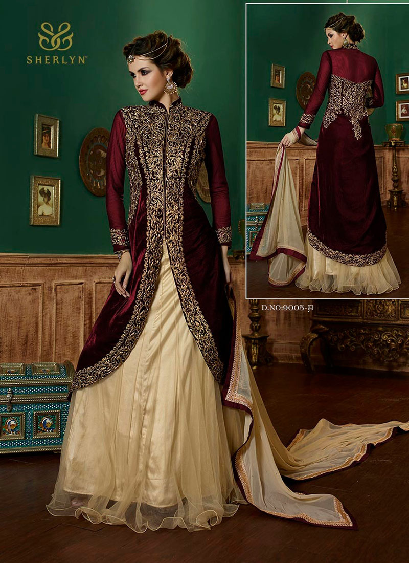 Tan Maroon9005A Velvet NetSatin Embroidery Wedding Lehenga Choli at Zikimo - Zikimo.com - Original Indian Bridal Lehengas Collection