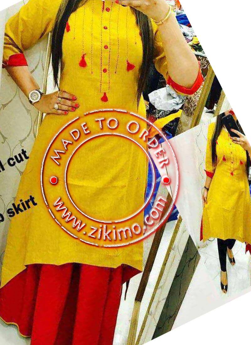 Yellow Cotton Tail Style Long Kurti Designed With Pom Pom AndCotton Skirt.Note: This is Semi stitched and needs to be fitted and stitched according to your size. If You Opt Stitching Option,Measurement chart will send to you via email after placing order