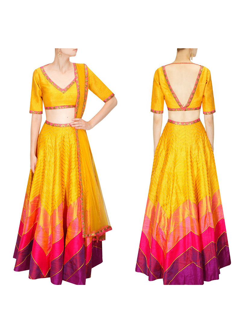 Navratri Special Embroidered RawSilk Yellow Magenta Multcolor Digital Printed Multicolor Zigzag Design Lehenga With YellowCholi and Dupatta. Note: This is Semistitched and needs to be fitted and stitched according to your size. If You Opt Stitching Option, Measurement chart will send to you via email after placing order.