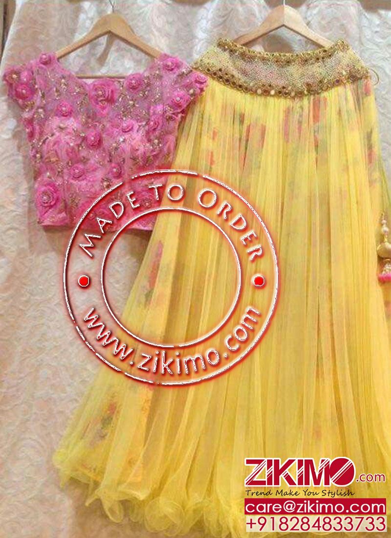 YellowPink38646 Net RawSilk Mehandi/Sangeet Floral LehengaCholi at Zikimo - Zikimo.com - Original Indian Bridal Lehengas Collection
