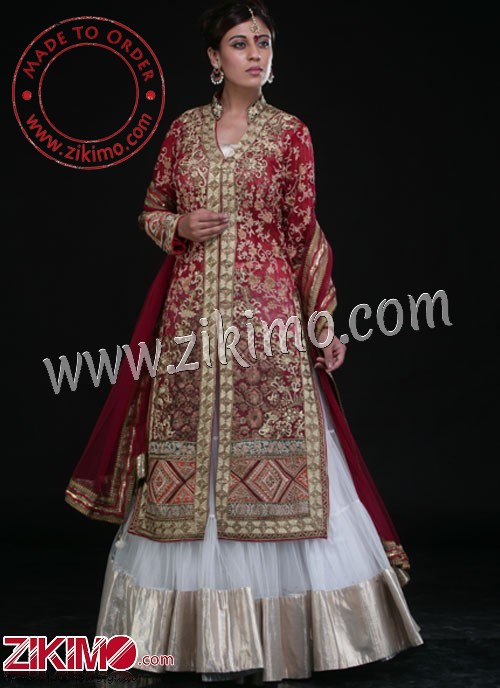 Convey a particular style message on your fantasy day with this red and white architect lehenga highlighting perfect resham weaving. The conversion of flower and geometric work decorates the knee-length, neckline V-neck choli. The set incorporates a net dupatta and a standing out white lehenga from gleamed hemline.